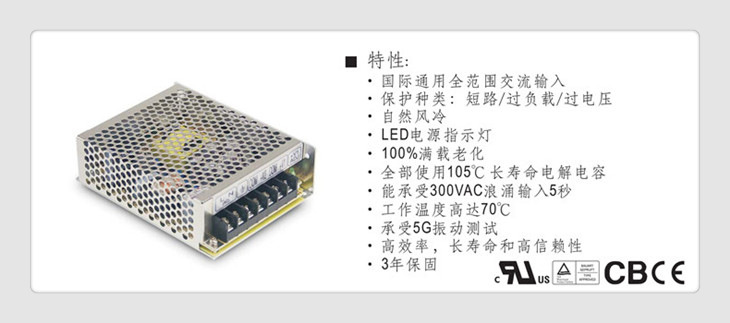 高可靠开关电源机型, 可承受5G震动与70°C高工作环温,全机使用105°C高寿命电解电容,可承受300VAC突波输入达5秒,适合使用于较严苛的工作环境,。