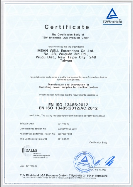 bb平台体育艾弗森企业股份有限公司(MEAN WELL ENTERPRISES CO., LTD) 通过国际认证单位TUV验证稽核,于 2017年5月正式取得欧盟医疗器材质量管理系统EN ISO-13485 : 2012的认证。